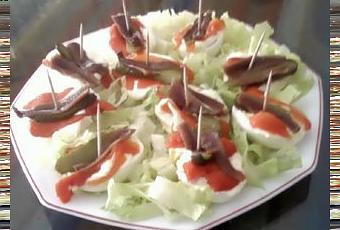 Ingredientes:2 rebanadas de pan inglés6 huevos1 lata de anchoasPerejil1 bote de maíz1 pimiento morrón1 taza de vinagre2 cucharadas de aceiteModo de Elaboración:En una sartén doramos las rebanadas. Por otro lado escalfamos los huevos con un poco de vinagre y agua hirviendo. Los dos huevos los colocaremos encima de las dos tostadas.También pondremos el maíz, que se mezclará con pimiento morrón picado. Echamos un poco de aceite y unas gotas de vinagre. Para finalizar añadimos perejil picado, filetes de anchoas y servimos enseguida. Es recomendable usar un pan que soporte todo el peso.¡Buen Provecho!Vía: Recetario-cocina