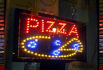 Siempre en la fiestas de Navidad y Año Nuevo me atraen las iluminaciones callejeras – las dos entradas (posts) previas les tienen como protagonistas. Y durante meses vi el cartel de “Pizza” que protagoniza esta entrada, sin tener oportunidad de fotografiarlo – a lo lejos creí que era un viejo neón, al más puro estilo “vintage“, pero el día de la Cabalgata de Reyes, apartándome de la multitud, logré acercarme lo suficiente al cartel luminoso que era mi objetivo, como para poder fotografiarlo, y detallar que en realidad se trata de una pieza integrada por modernos leds. Leds como algunos de la iluminación navideña o del árbol en la Plaza que se reflejan en la cristalera de la puerta en la Pizzería.