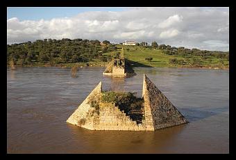 El río Guadiana sirviendo como frontera luso-española pasa bajo las ruinas del Puente de Ayuda, visto desde la orilla extremeña.