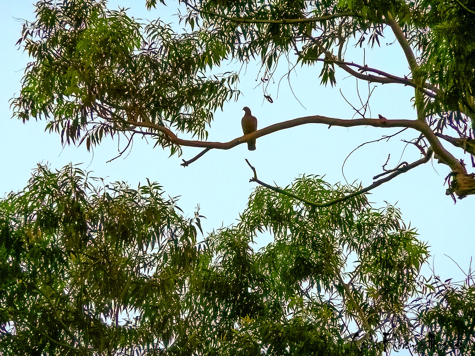 Predomina el verde de las hojas y sin embargo la vista se dirige a la paloma en lo alto de la rama.