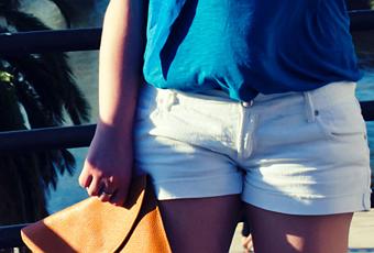 El pasado sábado me tocaba un día duro de trabajo, así que aposté por un outfit muy sencillo y fresquito. Esta camiseta hace mucho que la tengo, y me encanta, tanto por el color como por el toque femenino del lazo, decidí combinarla con short blanco, bailarinas navy y para romper el efecto bicolor, clutch en naranja tostado.