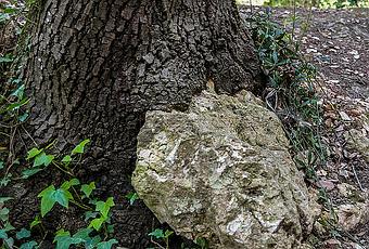 Los árboles de la Font de l'Horta son realmente dignos de contemplar. Aquí una roca de gran tamaño incrustada (o casi absorbida) en el tronco de un árbol.