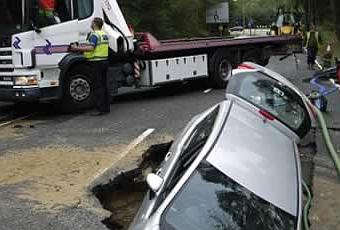 El automovilista era una mujer, ella escuchó un fuerte ruido que salía de la carretera, pero en cuestión de segundos el camino se colapsó y se tragó el auto. La policía llegó poco después y a las 7 de la mañana la carretera ya estaba cerrada. El agua cesó de salir a las 8.30 am y a la hora del almuerzo del miércoles pasado, la carretera seguía cerrada.