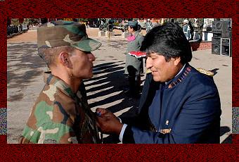 Irónicamente, antes se condecoraba a los soldados por el valor en batalla. En estos tiempos revolucionarios la cosa ha cambiado. Basta extraviarse como atolondrados en territorio enemigo (quiero ser inocente para creer que estaban persiguiendo al crimen organizado). En contra de lo que dicta el sentido común, aquella vez, los militares fueron recibidos como héroes y, al poco tiempo, ascendidos de grado y condecorados por el mismo presidente (foto). Ni una sola investigación, ni nada de nada. Hoy, los tres soldaditos imberbes, seguramente ya se frotan las manos mientras duermen en celdas chilenas. En Chile, existe la impresión generalizada de que en nuestro país se premia a los delincuentes. Aquí, aplaudimos la valentía del hermano presidente por denunciar a los malvados chilenos. No sé qué es más esperpéntico: que los yanquis otorguen medallas a sus pilotos por apretar un botón o que Evo condecore la ineptitud de nuestros militares. Así nos va. Otra muestra más de la salsa plurinacional en la que nos revolcamos. Y además picante, con Chile nada menos.