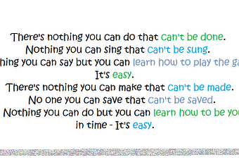 No hay nada que puedas hacer que no se pueda hacer.Nada que puedas cantar que no se pueda cantar.Nada que puedas decir pero puedes aprender como jugar el juego.Es fácil.No hay nada que puedas hacer que no pueda hacerse.Nadie a quien puedas salvar que no pueda ser salvado.Nada que puedas hacer pero puedes aprender como ser tú mismo.Es fácil.