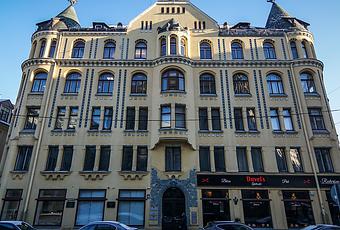 Se encuentra en la plaza Līvu laukums, cerca de la Pequeña Gilda (Mazā Ģilde). Construida en 1909, es un ejemplo de art nouveau con influencias medievales. Destacan sus detalles ornamentales y la estructura en tonos amarillos. En el tejado hay dos figuras de gatos negros con el lomo arqueado y la cola levantada.