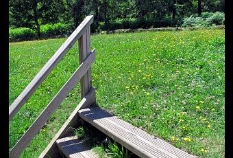 Como esta escalera de madera que lleva al prado, con esa explosiòn de verde tan veraniega salpicada de colores intensos por humildes florecillas silvestres.