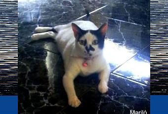 Con respecto a los humanos de la casa: a mí me tolera y, de vez en cuando, me deja acariciarla y besarla (yo soy la que la reprendo), mientras que mi pareja ha resultado ser su absoluta pasión. Lo adora, se le tumba en la tripa, acude a su llamada, duerme con él, le permite que la acaricie entera...Lo que me alegra enormemente. Por ello, es él quien figura como su amito en todo el papeleo referente a su adopción.