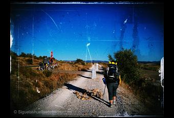 Pero a pesar de lo corriente del camino ocre, de las piedras y la hierba tan poco significativas, o los sembrados que nos escoltaban por todos los lados, esa mañana, cuando sólo llevábamos tres o cuatro kilómetros andados, supe que seguramente nunca en mi vida volvería a darse el caso de desplazarme con una mochila a cuestas durante doscientos cincuenta y cinco kilómetros andando por caminos con un montón de horas por delante para mirar, viendo de verdad. Empapándome detenidamente de todo lo que veía para fijarlo con Super Glue en mi desentrenada retina… ¡a lo mejor sólo por eso ya merecía la pena el asunto en el que acababa de embarcarme…! A lo mejor…