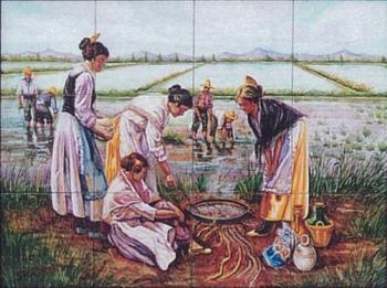 El arroz. Es bien sabido que procede de Asia, apareciendo en el sudeste de España en el siglo VI, y siendo implantado en los alrededores pantanosos de la Albufera en el siglo VIII, posteriormente se diversificó hacia el norte de la Comunitat, hacia el Delta del Ebro y hacia el sur.