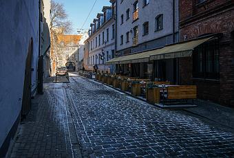 Junto a la antigua casa blanca en la calle de los cerveceros de Riga, donde se puede apreciar la inclinación de la pared hacia la derecha. Al fondo la llamada Puerta Sueca, que es la única que queda de las antiguas murallas medievales. Fue construida en 1698, durante el periodo en que Riga estaba bajo el control del Imperio Sueco (1621-1710), y su función era proporcionar acceso a las áreas residenciales internas de la ciudad fortificada.