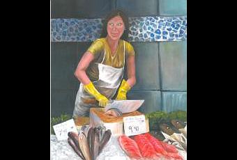 Siempre me había apetecido pintar un bodegón de peces, pero resultaba poco práctico ponerse en la pescadería del Mercadona con el caballete y los pinceles. Tampoco era una buena idea comprar un surtido de pescados variados para que posaran como modelos, porque cuestan una pasta, son difíciles de conservar y tienen una conversación más bien aburrida cuando posan, así que me conformé con una foto de una simpática pescadera, la tuneé un poco y hala, me lo he pasado genial pintando peces.