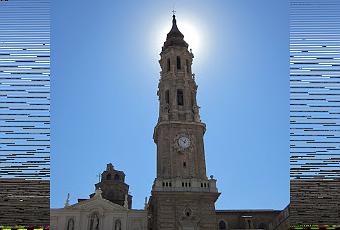 Hola caminantes que se hacen camino al andar, con cámara en ristre. En la ciudad de Zaragoza existe un monumento excepcional, que desde pequeño me llamó su atención por la belleza de sus formas. Es la torre-campanario de la catedral de San Salvador, denominada también La Seo. Su construcción se inicia en 1686. Dos curiosidades: una, el chapitel que corona la torre tuvo que rehacerse de nuevo tras el incendio sufrido en 1850; dos, el reloj del segundo cuerpo de la torre está rodeado varias figuras que simbolizan el Tiempo y la Vigilancia. Justo en el piso superior, en el tercer cuerpo, se representan las figuras de las cuatro virtudes cardinales. (ref: guía histórico-artística de Zaragoza, pg. 134) La toma realizada en la imagen oculta el sol, una mañana de domingo, no hace mucho...
