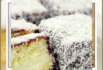 Procedimiento1. Precalentar el horno a 180ºC. Engrasar un molde cuadrado. Batir los huevos y el azúcar hasta espesarlos. Incorporar la harina, el agua y la mantequilla, y remover. Verter la mezcla sobre el molde y cocer hasta que tenga cuerpo. Dejar enfriar en una rejilla.2. Batir los ingredientes de la crema hasta obtener una masa cremosa. Cortar el bizcocho en 16 cuadrados, y estos por la mitad horizontalmente, con la crema en medio.3. Para el glaseado, tamizar el azua r y el cacao. Fundir la mantequilla y calentar la leche en el microondas a temperatura alta. Cubrir los cuadrados con la mezcla de azúcar, escurrirlos y decorar con el coco. Dejar secar toda la noche para que el glaseado se asiente.