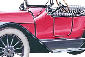 Esta representación creada por artistas fue proporcionada por General Motors y muestra un Chevrolet Royal Mail de 1914. Con el orgullo deportivo hacia el nuevo emblema de Chevrolet, el automóvil concebido de $750 de la Serie H "Royal Mail" roadster (o coche de turismo) de 1914 era un coche potente y asequible de 4 cilindros que conquistó a los compradores jóvenes.