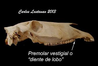 La fórmula dentaria es I3/3; C1/1; PM3/3; M3/3 en el caso de los machos e I3/3; C0/0; PM3/3; M3/3 en el caso de las hembras. En algunos ejemplares pueden aparecer cuatro premolares siendo el primero de ellos pequeño y no funcional, y que se conoce como “diente de lobo”. En las fotografías de arriba podemos advertir uno de estos molares en el maxilar superior derecho.