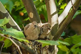 Llevo 4 semanas encerrado en casa y justo ayer descubro una pareja de pollos de tórtola turca (Streptopelia decaocto) que han nacido frente al balcón de mi casa y a los que se les ha quedado pequeño el nido. En pocos días van a echar a volar y yo me habré perdido toda su evolución. Voy a tener que salir más al balcón. El teletrabajo me absorbe demasiado.