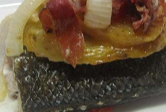 2 Lubinas2 Patatas grandes1 Pimiento rojo1 Cebolla Grande4 Lonchas de Jamón (Este a gusto del consumidor, pero no es necesario que sea pata negra. De todas maneras si tenéis es preferible que os la vayáis comiendo acompañado de una cerveza o un buen vino, el plato sale mucho mejor) je.je.je.