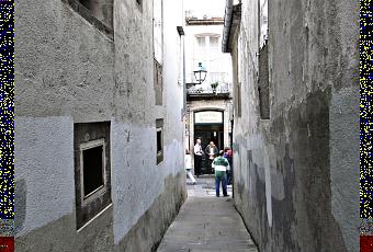 Estrecha callejuela medieval en Santiago de Compostela; al fondo, restaurante. Mediodía – tarde del 12 de octubre, 2012
