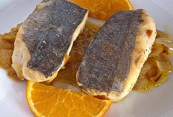 - Emplatamos poniendo un par de cucharadas de cebolla en el plato y sobre ella el pescado. Regamos con la salsa y adornamos con una rodaja de naranja.