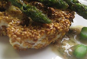 3 Espárragos trigueros 1/2 Cebolla1 Cucharada de harina, No muy grande.1 Cucharada de vinagre de ManzanaSésamo tostadoAceite de oliva, sal, copita de vino blanco, otra copita para el cocinero y entre copa y copa comenzamos el plato.1º - Cogemos un molde redondo y introducimos la rodaja de Merluza (No es necesario, pero queda mejor presentado).