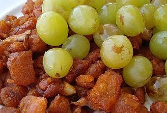 Ingredientes:· Un pan de kilo del día anterior.· Dos cabezas de ajo.· Medio kilo de chorizos.· Medio kilo de forro de cabeza de cerdo.· Medio kilo de panceta de cerdo.· 200 gramos de tostones de pan de tamaño medio.· dos vasos de agua.· 1/3 de litro de aceite de oliva (equivale a vaso y medio de agua).· Sal.Preparación (para cuatro personas).Es recomendable que esta receta sea elaborada con leña, generalmente sarmientos.Poner el aceite a freír en una sartén de patas sobre la lumbre, una vez reducidas las llamas fuertes.Echar el forro de la cabeza troceado, la panceta y los ajos.Una vez fritos se apartan y se reservan.Poner ligeramente en el aceite los tostones y se separan también.Añadir el agua a la sartén con la sal previamente diluida.Agregar leña y cuando empiece a hervir, poner el pan finamente cortado en láminas cortitas.Mover con una espumadera hasta que las migas se suelten.Este plato es ideal para servirlo acompañado de de uvas.Fuente: tomelloso.esFoto: mercadocalabajio