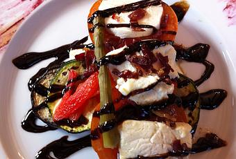 Se pone en una sartén con unas gotas de aceite a tostar las verduras, agregándolas una pizca de sal. Una vez listas se van posicionando una capa encima de otra y se adorna con crema de vinagre de módena. ¡Listo!