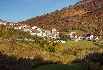 Los tejados de las casas tienen las mismas tonalidades que el entorno otoñal de Orbaizeta.