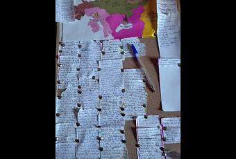 Mi corcho cada vez se ve menos y está más plagado de papelitos con notas de sucesos. Estoy muy, muy contenta con el rumbo que tiene la historia y espero que siga avanzando como hasta ahora. En el mapa ya he señalado algunos puntos que aparecerán proximamente en lo que escriba y en las notas más de lo mismo.