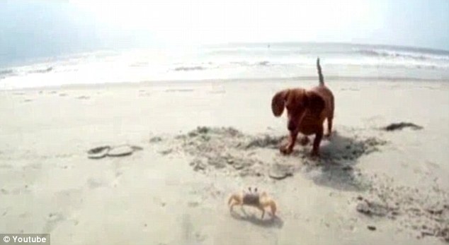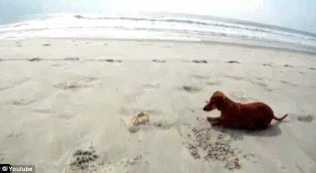 Madeleine, una preciosa perrita salchicha, de dos años, estaba paseando con su dueño por una playa de Carolina del Sur, cuando de pronto descubrió a un cangrejo blanco y seguro que pensó "Guauuuu, un nuevo amiguito para jugar".