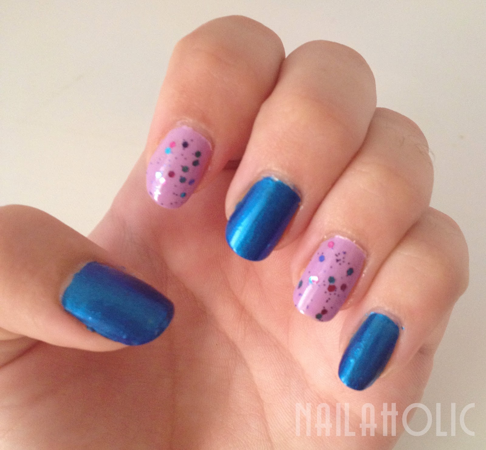 En las fotos no se aprecia bien, pero en el bote se le ven como reflejos morados y por eso decidí combinarlo con este lila tan mono de KIKO también que aún no había estrenado. Y para dar el toque (y porque creo que venía de perlas) el Polka.com de OPI.