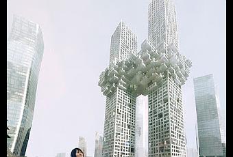 Son dos rascacielos que, aparte de sus prismáticas evidencias, soportan una airosa composición de células libremente encadenadas, enganchadas a ellos, en un nuevo desafío a la forma, al simbolismo y a la ley de la gravitación universal.