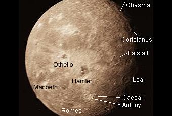 - Esta distante luna de Urano está compuesta mitad de roca y mitad de hielo. Su superficie es una picada masa de cráteres y cañones: un paisaje fácil para perderse o esconderse. Su orografía toma nombres de las obras de Shakespeare y Pope famoso escritores ingleses de siglos anteriores a La Caída.