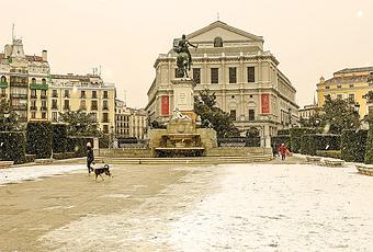 Vista del Teatro Real y de la Plaza de Oriente durante el comienzo de la mayor nevada en Madrid