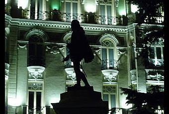 Cervantes frente al Congreso de los Diputados, apenas una sombra, pero es él.