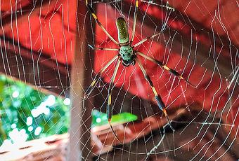 La araña de seda dorada (Trichonephila clavipes) de la otra noche espera pacientemente que caiga alguna presa en su tela. El hijo de la tela de esta araña es tan resistente que es capaz de atrapar hasta colibríes.