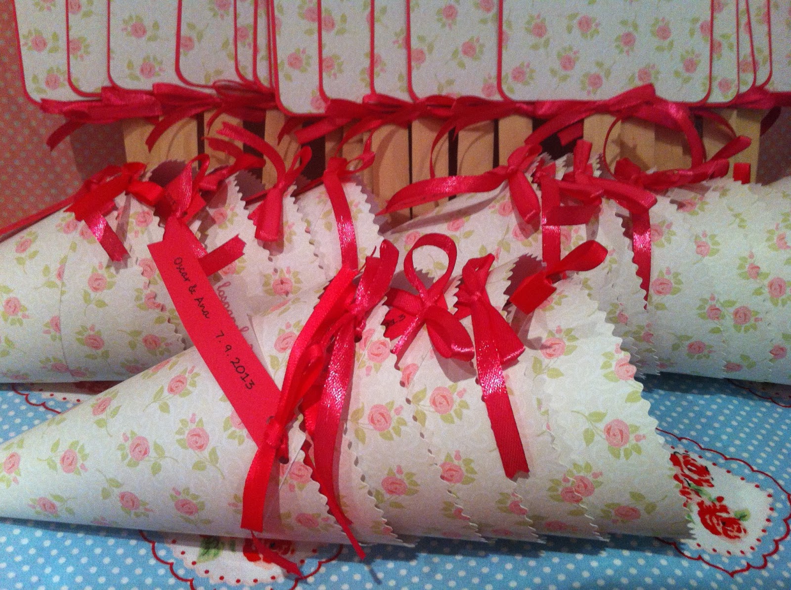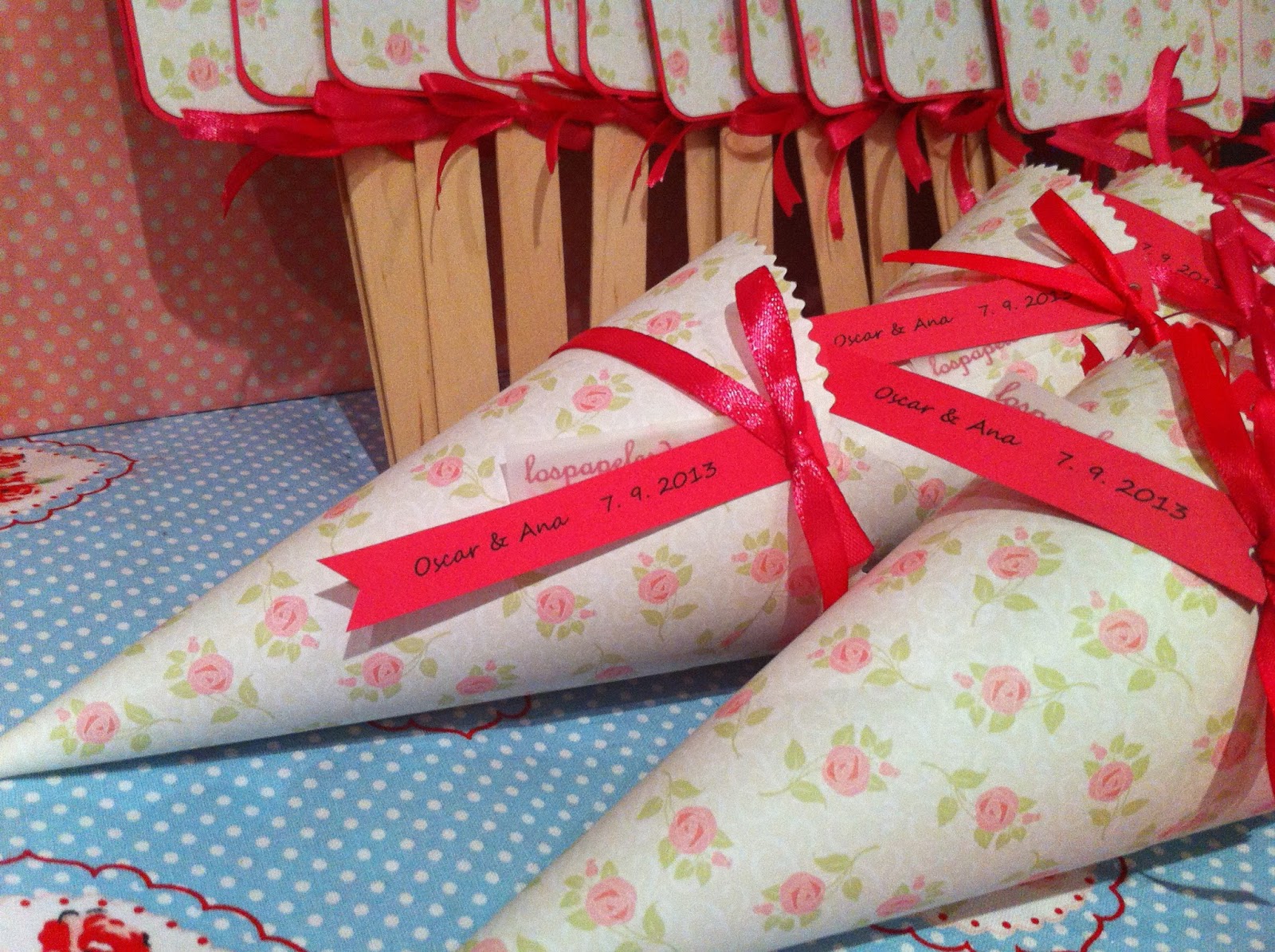 Los paipais los hemos hecho con dos cartulinas de distinto gramaje y el palo va colocado entre ellas, asi por la parte de atrás no se vé y queda muy limpio Y unos conos también estampados, decorados con un lacito rosa y una etiqueta alargada, donde hemos impreso el nombre de los novios y fecha del enlace En ellos, pondrán pétalos de rosas.... ¿No os parecen preciosos?