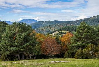 Éste es el bosque a través del cuál hemos llegado a los Rasos de Clarent. Al fondo asoma la «enforcadura» del Pedraforca, y a la izquierda la Serra d’Ensija.