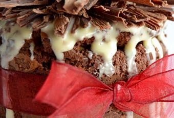 Decorar con chocolate blanco fundido y virutas de chocolate. Lo podéis acompañar con nata montada o algún fruto rojo.
