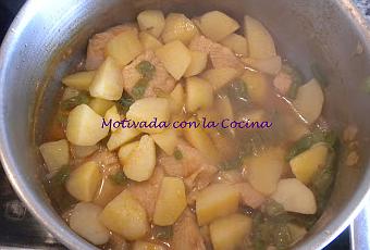 6. Si se quiere en este paso, se añadirá los guisantes.7. Se añade agua hasta cubrir todo y se deja cocer durante 20-25 minutos.
