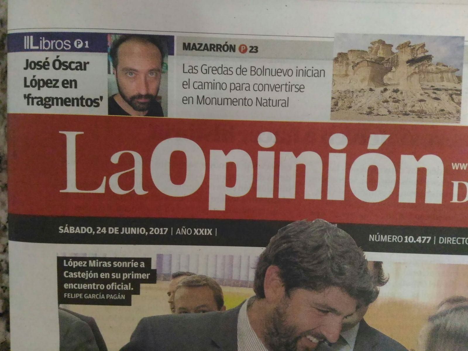 Lo hizo ayer en La Opinión de Murcia, a toda página y abriendo el suplemento de libros. De lujo, vamos. Os dejo aquí el enlace a su blog, donde se reproduce íntegra su crítica. No me resisto a citaros aquí algún otro momento de su fantástica reseña: