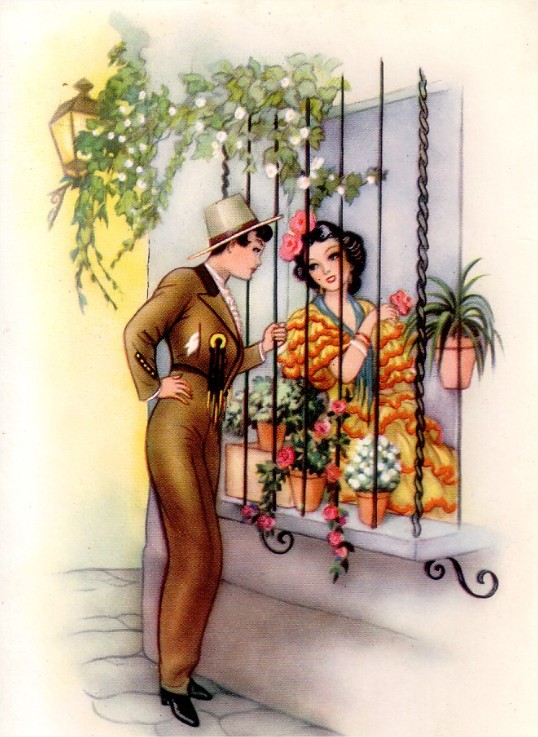 La muchacha se sentó junto a la ventana enrejada (algunas fuentes indican un balcón) y allí se puso a desplumar al ave; cuando apareció por allí el joven que la pretendía y ambos comenzaron a hablar.