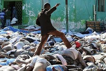 Y esta otra, “El lugar elegido es el estacionamiento de la morgue de Puerto Príncipe y el concurso parece que consiste en premiar a quien consigue meter a más muertos en la foto.” de Gonzalo Peltzer en “Es al revés”.
