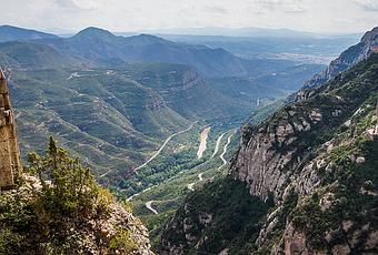 Una vista del valle del Llobregat desde el camino que baja a la Santa Cova, que aparece arriba a la derecha. Al fondo Olesa de Montserrat.