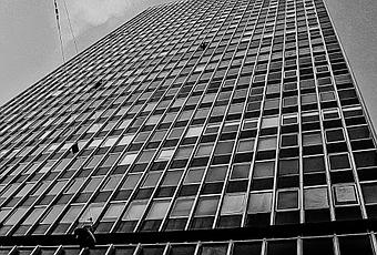 Desde mi posición parece como un gigante que emerge como escalera buscando el cielo.Un bloque de cemento y vidrio cual panal absorbe el trabajo de incontables abejas que lo habitan.
