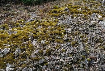 El musgo intenta sujetar las piedras sueltas de la Tartera de Mata-rucs. Dicen que este nombre le viene de lo peligroso que era éste camino para los burros de los monjes de Poblet.