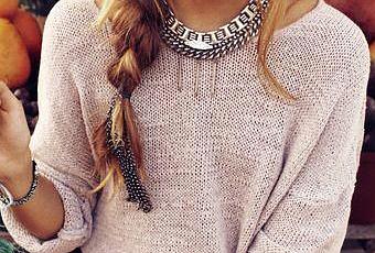 Éste es el look que a mí me gusta para la temporada primavera-verano: trenza medio despeinada, jersey de punto y shorts de color rosa pálido, y un collar plateado para contrastar.