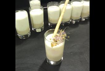 Con esta mezcla cargamos el sifón y se sirve en los vasos encima de la natilla de cebolla (la cantidad será de otro tercio la altura del vaso)