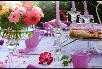 Rosas naturales esparcidas sobre el mantel de lino en tono malva sobre el que juegan, a las 3 en raya, floreros acopados con rosas y cintas verdes. Y velones con vela malva y su llama encendida; amén de servilletas moradas perfectamente apergaminadas y cerradas a cal y canto por una cinta en transparencia, cómo no, en rosa claro. Y como compensando la falta de gama en tono lady, unas tazas con sus platos también en malva. Afortunadamente los cubiertos se han prestado a la revolución antiprotocolaria para permanecer tal cual fueron creados, acerándose aún más por los reflejos del sol en tentempié obligado.