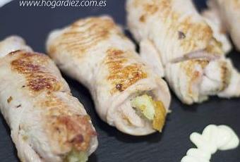 Enrollamos la carne y la sujetamos con la ayuda de un palillo. Marcamos en la sartén con un poco de aceite y los acabamos de hacer en el horno a 200º durante 20 minutos o hasta que estén dorados.